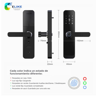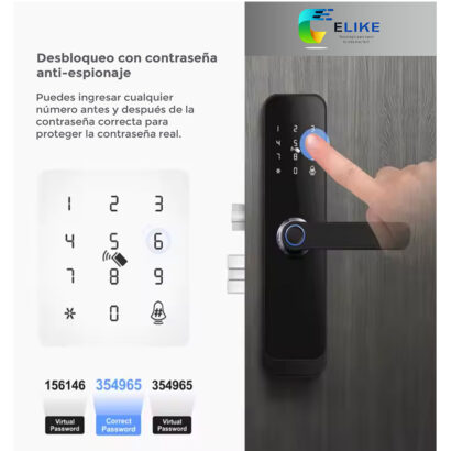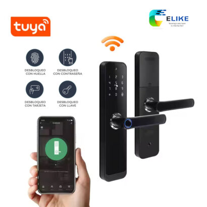 Cerradura intelingente Digital WIFI con varios metidos de acceso. La cerradura inteligente Elike Madrid está diseñada para ofrecer una experiencia de seguridad moderna y conveniente, permitiendo el control remoto a través de la aplicación Tuya. Es ideal para hogares, oficinas, hoteles, Campus o cualquier otro lugar donde se busque una solución de seguridad inteligente y conveniente con un manejo ágil, simple y remoto de los accesos.  Ampliamente utilizada en alquileres temporarios (Airbnb).